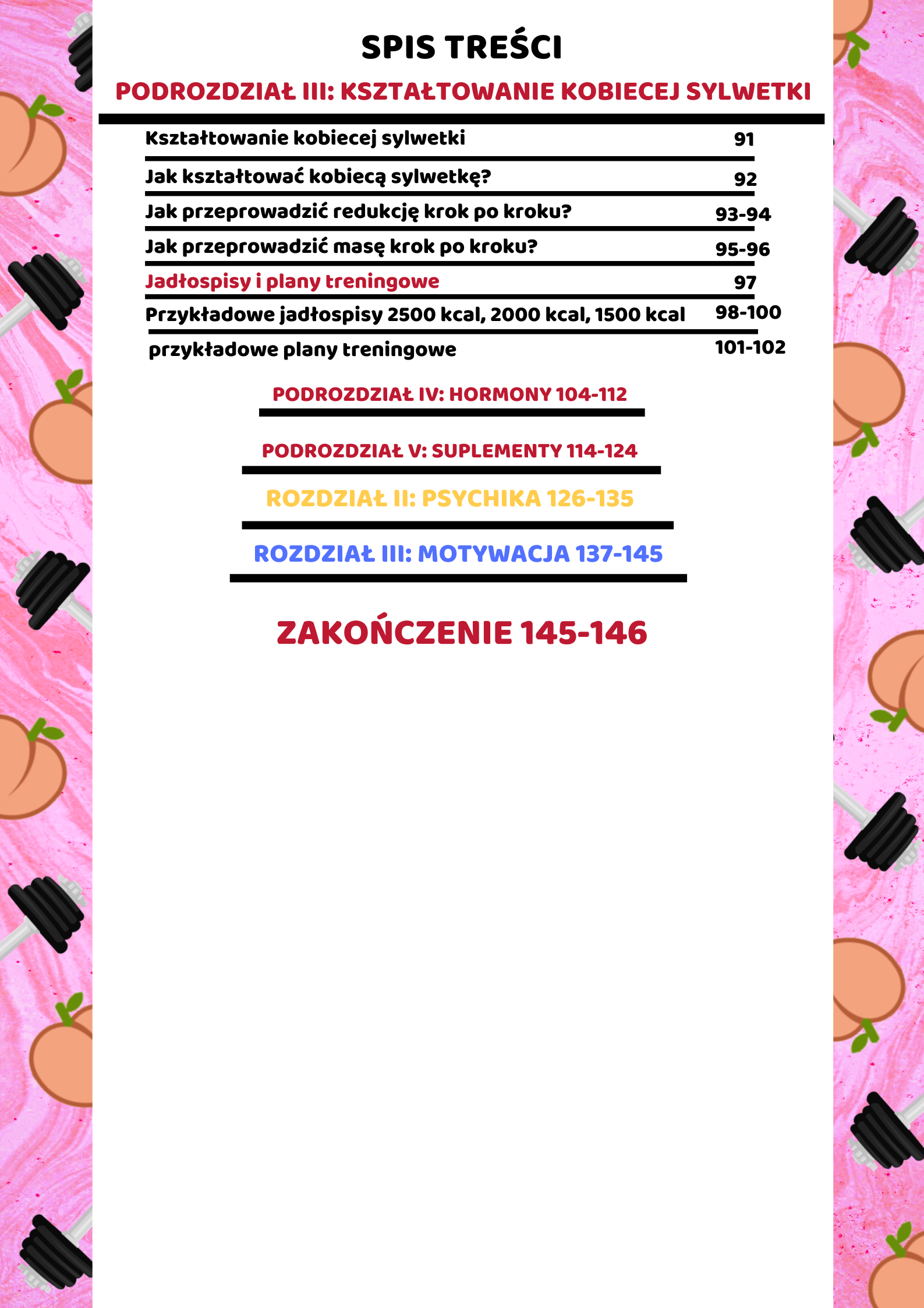 W tym E-BOOKU pokaże Ci w prosty i zrozumiały sposób jak krok po kroku dojść do wymarzonej sylwetki, która zostanie z tobą na lata a nie na tylko jedno lato! Dołożyłem wszelkich starań aby E-BOOK był kompletny i zawierał dosłownie każdy składnik, który według mnie jest potrzebny do kształtowania kobiecej sylwetki czyli min. Wiedza, Jadłospisy, Plany treningowe, Psychika i motywacja!